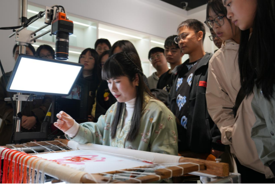党员同志们来到位于桃子湖的“非遗+科技”创新研发中心,首先听了一堂“科技赋能非遗,增进文化自信”的微党课。艺术设计系教工党支部王玥老师带领同学们深入学习践行习近平文化思想,就“推进文化与科技深度融合”这一命题,分享了自己的认识与体会。王玥说,科技赋能非遗传承及创新发展,呈现勃勃生机及光明前景。王玥介绍了非遗与科技融合创新的实践路径,指出科技助力文化保护传承提质、拓宽中国故事传播舞台、塑造文化多元业态以及促进产业转型升级等方面大有可为。王玥鼓励党员同志要以习近平文化思想为指导,锚定建成文化强国战略目,积极投身文化科技融合创新实践,为实现中华民族伟大复兴的中国梦贡献力量。