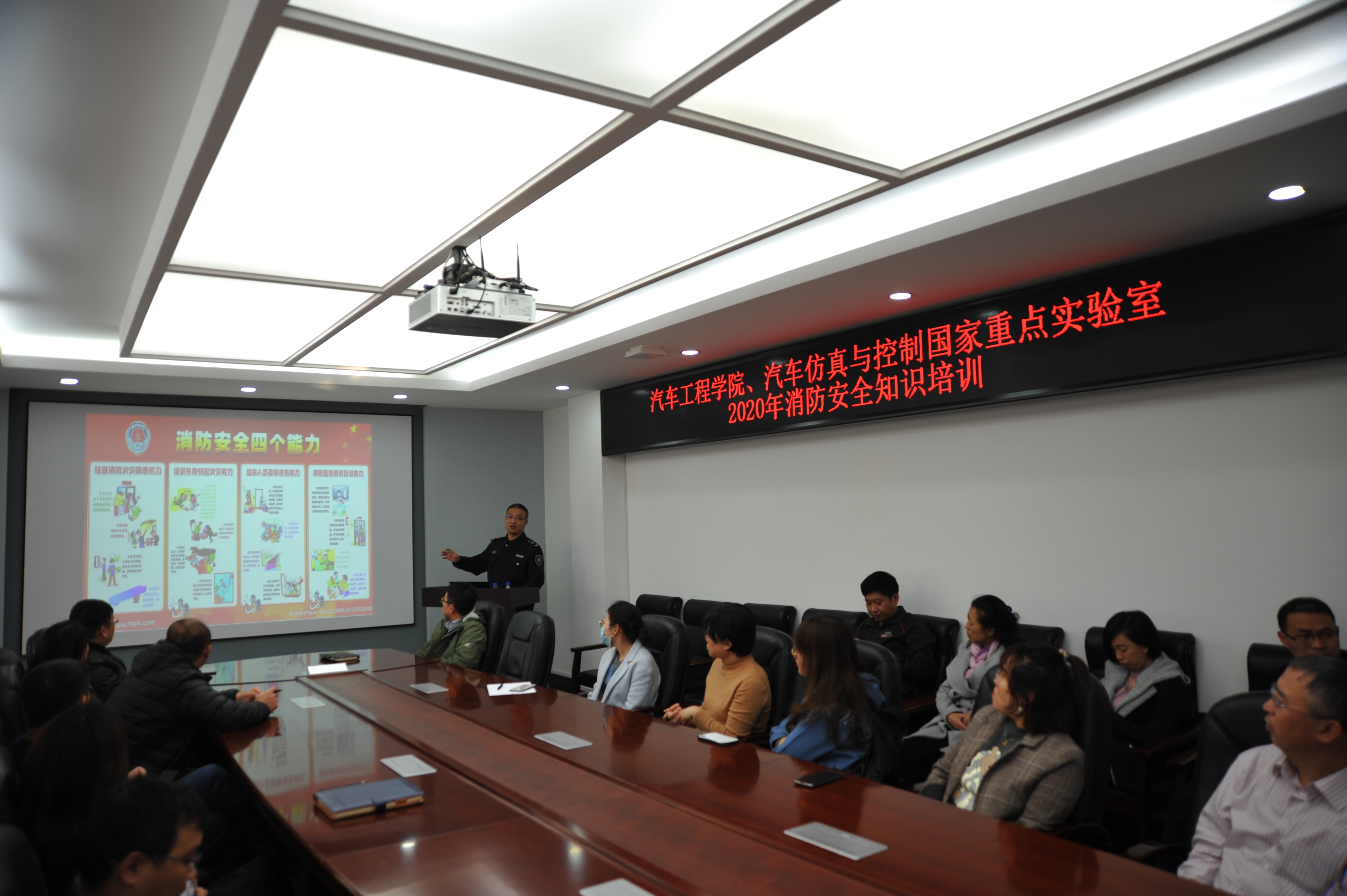 11月5日下午,新葡的京集团8814检测站、汽车仿真与控制国家重点实验室联合东区保卫办举行了“2020年消防安全知识培训与防火疏散演练”活动。学院行政副院长林海兰、重点实验室副主任杨得军以及师生代表参加了此次活动。本次活动分为安全知识讲座、防火疏散演练和消防器材使用三个环节。