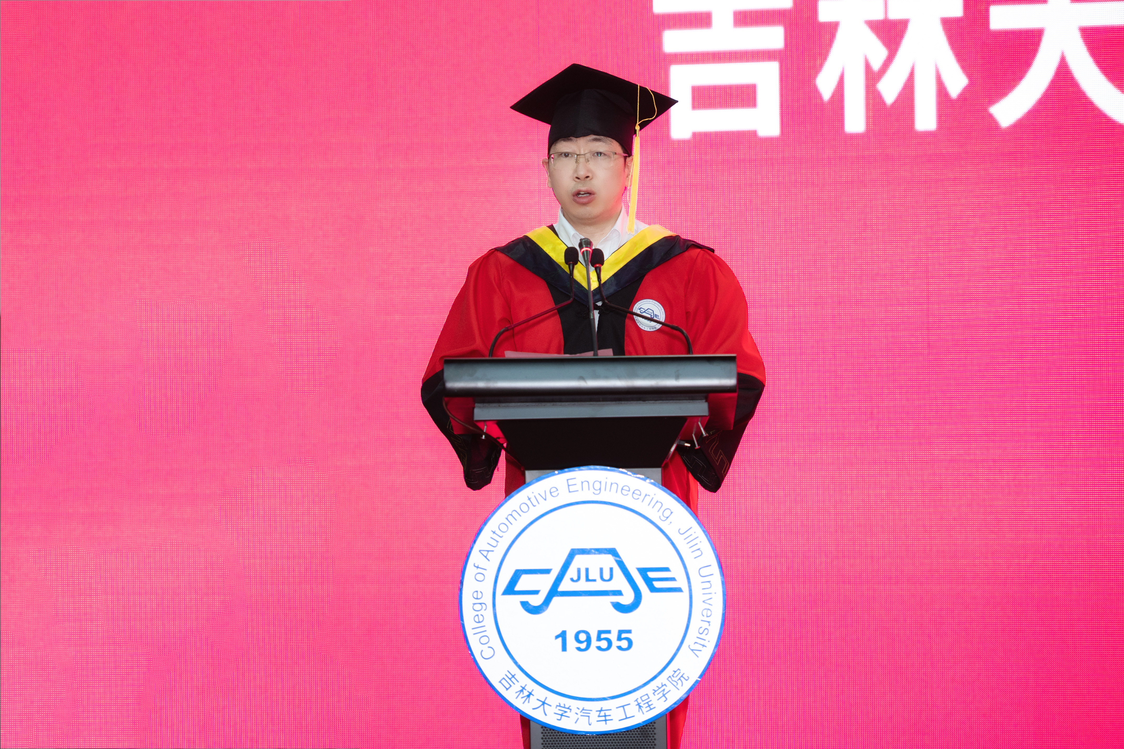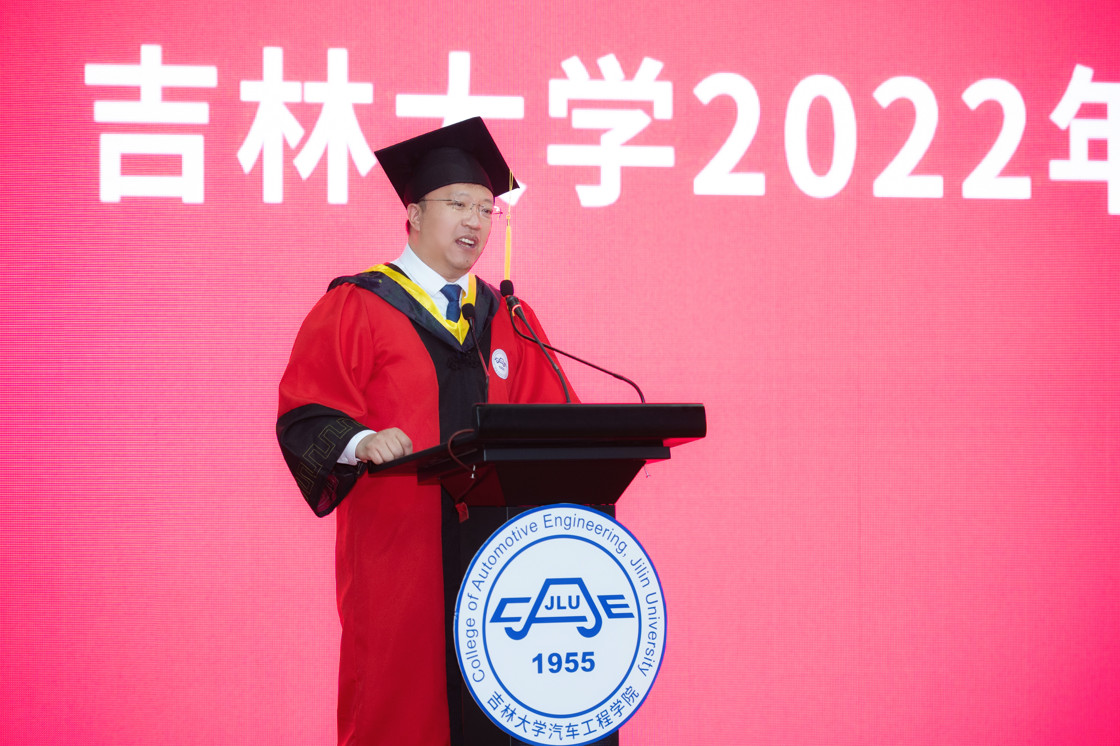 随后,院长高振海教授致辞。在讲话中他提到今年的毕业季由于疫情注定不平凡,云上毕业典礼也是史无前例,但改变的只是方式,不变的是对大家的祝福与期待。他与大家一起回顾了学生们入学以来的成长经历和各方面取得的优异成绩,极大地肯定了学生在思想建设、学业成就、学术创新、车队竞赛荣誉等各方面的亮眼表现。在临行之际,高院长对毕业生提出三点祝愿。一是希望大家坚守初心,怀揣理想,做习近平新时代中国特色社会主义思想坚定的信仰者、忠实的实践者,在中华民族伟大复兴进程中谱写激昂的青春乐章。二是希望大家回首过往,收获成长,勇敢地迎接风雨的洗礼,在困厄的境遇面前不坠青云之志,在历经沧桑之后不失赤子之心。三是希望大家饮水思源,服务社会,能够扛起大旗,承担起这一代应负的社会责任和道德责任,尽己所能去孝敬父母、回报母校、回馈社会。在讲话的最后祝福同学们,鹏程万里,前途远大,在自律自省中完善小我,在拼搏奉献中铸就大我。