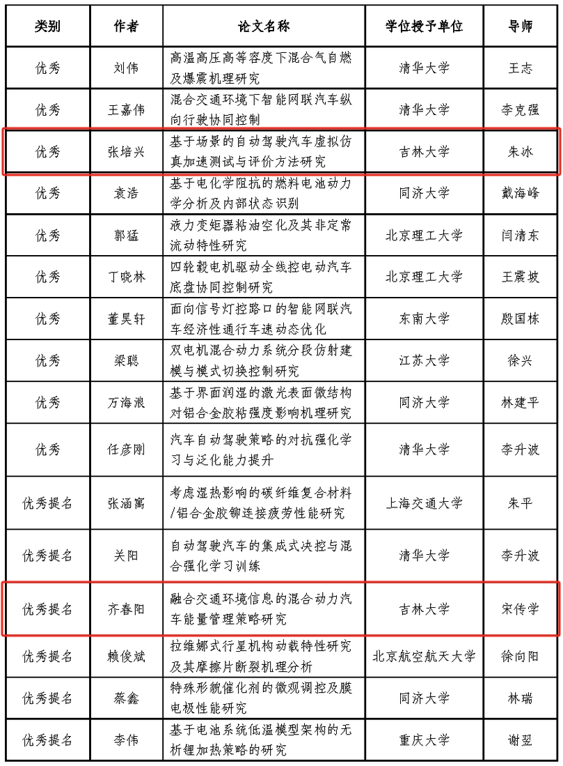 新葡的京集团8814检测站朱冰教授指导的张培兴博士毕业论文《基于场景的自动驾驶汽车虚拟仿真加速测试与评价方法研究》荣获“优秀博士学位论文”,宋传学教授指导的齐春阳博士毕业论文《融合交通环境信息的混合动力汽车能量管理策略研究》荣获“优秀博士学位论文提名”。