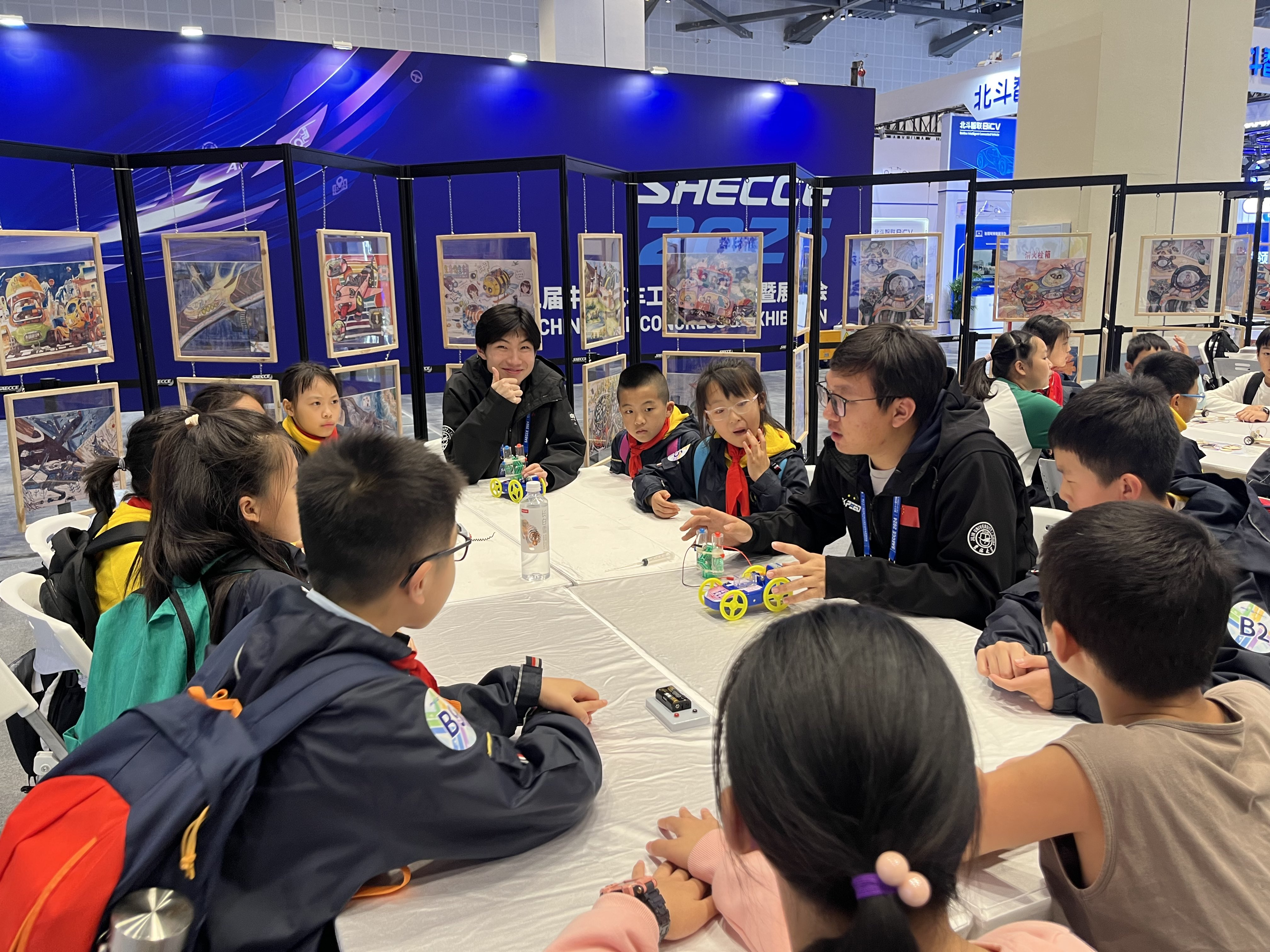 油车前队长高涵天和电车前队长赵正航为小朋友讲解赛车知识