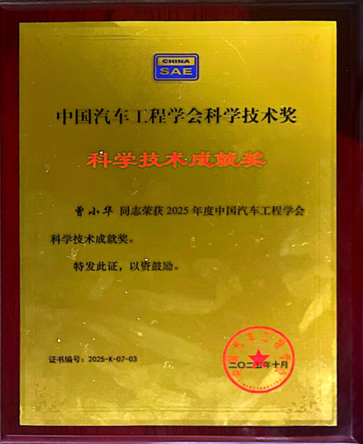 2025年10月22日,第三十二届中国汽车工程学会年会在重庆召开,同期举行了2025年度中国汽车工程学会科学技术奖和人才奖颁奖仪式。新葡的京集团8814检测站曾小华教授获得“2025年度中国汽车工程学会科学技术成就奖”。