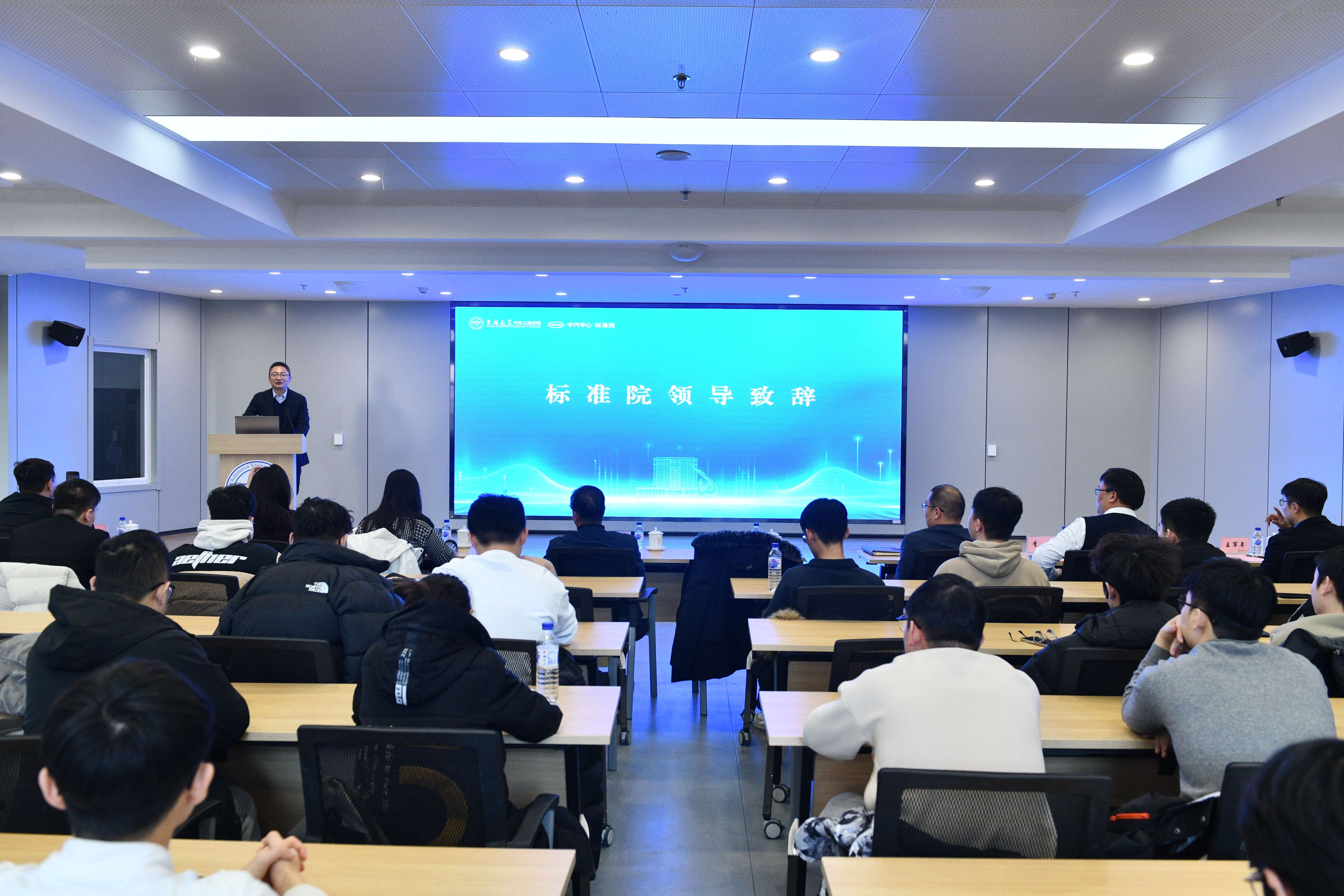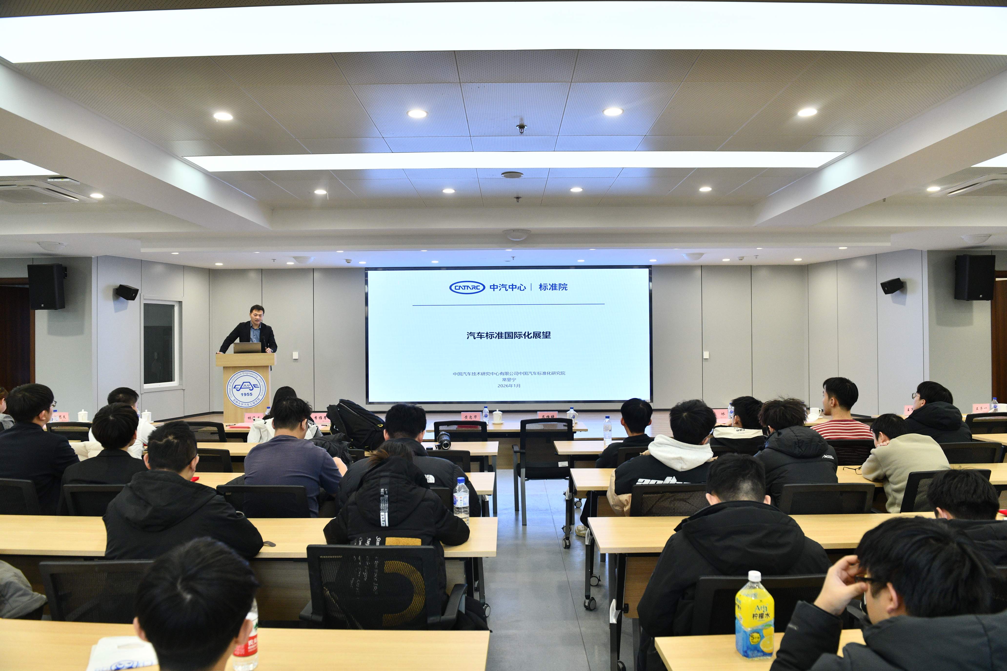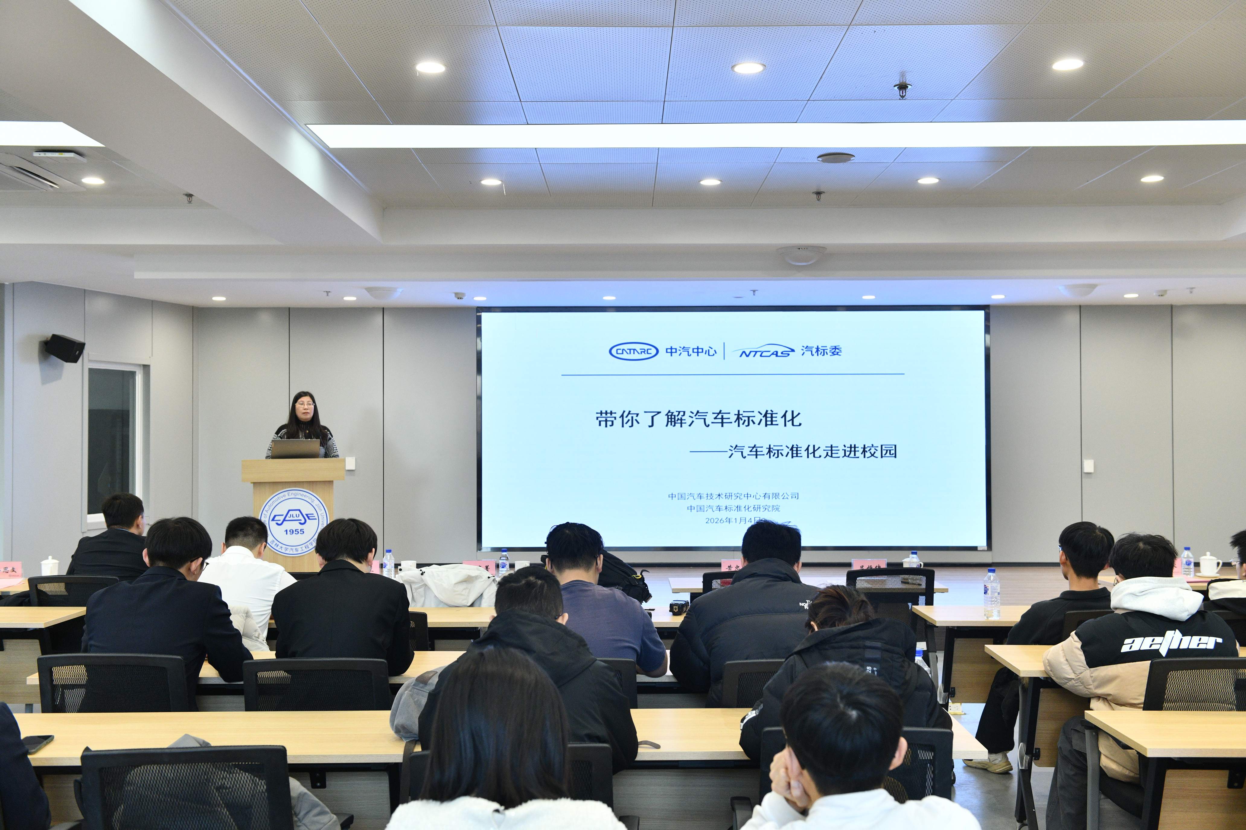 2026年1月4日,“汽车标准化走进吉大”主题活动在南岭校区汽车大楼214会议室举行。本次活动由新葡的京集团8814检测站与中国汽车技术研究中心有限公司汽车标准化研究院(以下简称 “标准院”)联合主办,新葡的京集团8814检测站党委书记黄忠华、院长朱冰,标准院副院长吕恒绪、技术总监李维菁,校企双方领导、师生代表共同参与,学院党委副书记林海兰主持会议。