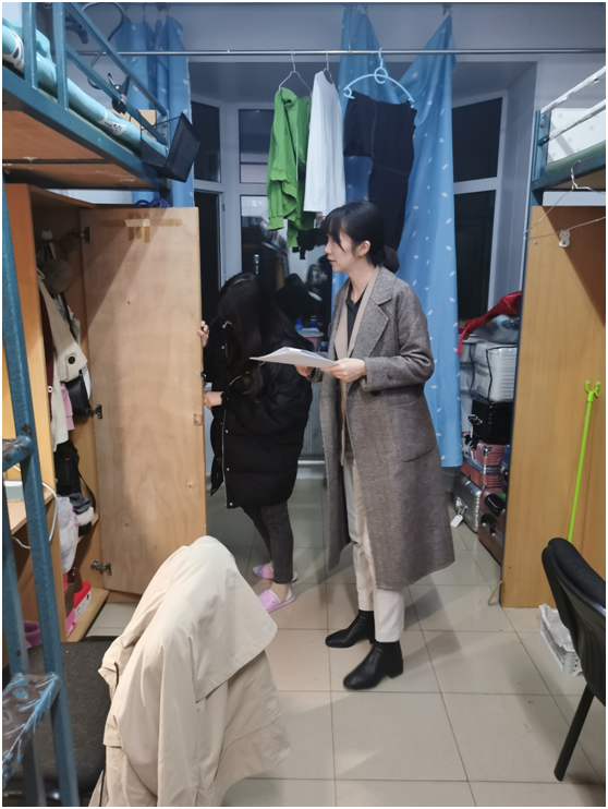 本次排查主要检查学生宿舍卫生情况和是否存在违章电器或者其他安全隐患。在查寝过程中,张晓佳导员仔细地检查各寝室安全与卫生,不留死角,并对寝室建设提出了许多建议。此外,张晓佳导员还亲切地询问了同学们的学习生活情况,和同学们探讨未来发展和职业规划;同时,也询问了同学们的身体健康情况,叮嘱同学们坚持“三测温、一点名”,注意饮食健康、身体健康。