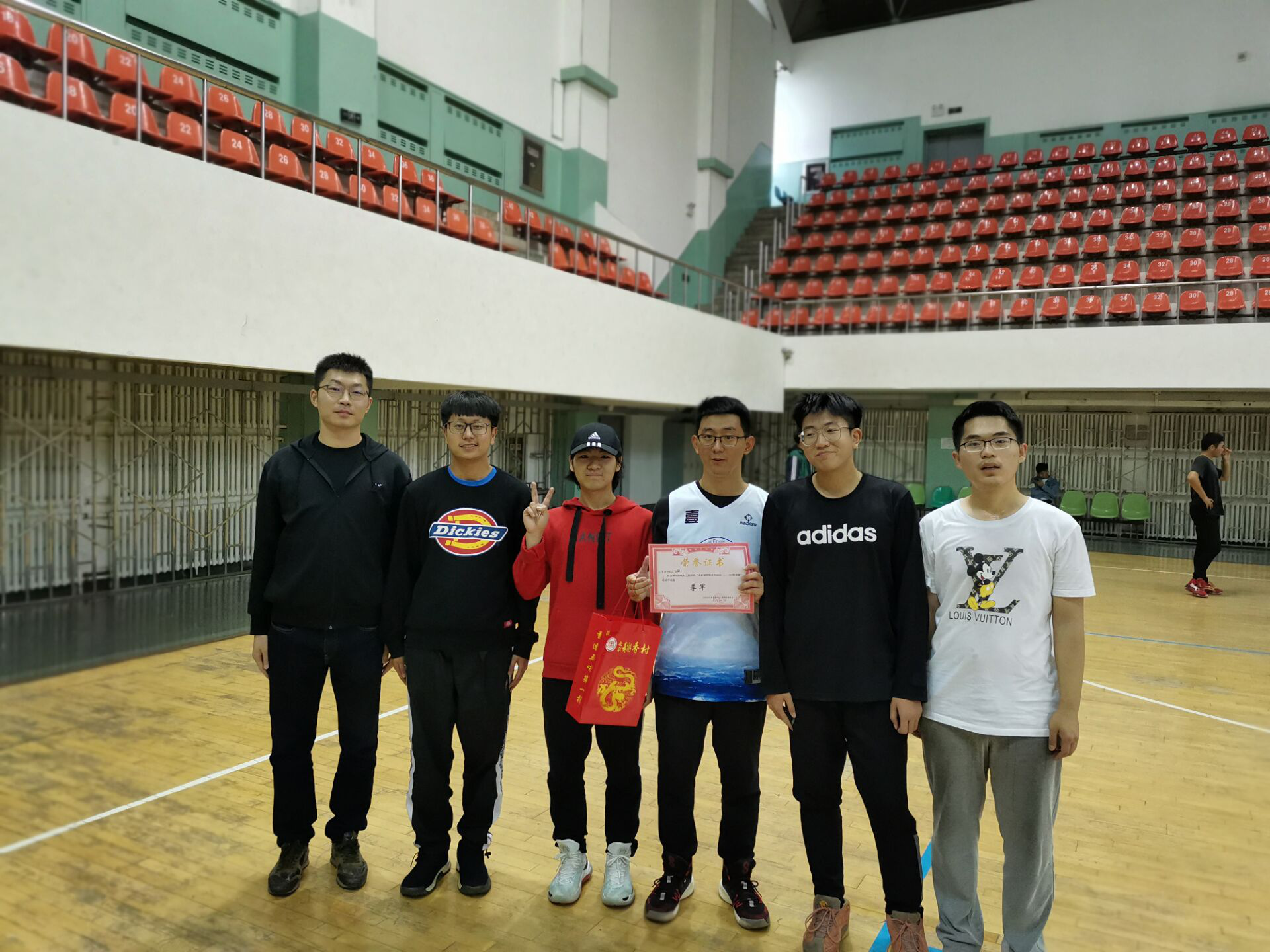 经过前几轮的比赛的层层筛选,留在决赛的这两支队伍可谓实力强劲。比赛一开始,就火药味十足,双方选手针尖对麦芒,进攻防守转换十分迅速,一方投进一记三分,另一方就以犀利的突破还以颜色。双方上半场僵持不下,比分一度来到15比15打平。由于“四个大腿队”一次失误,防守篮板丢失,“国庆假日八连胜队”抓住机会,以一记三分,将比分拉开差距,上半场结束。下半场双方攻势依然猛烈。但最终由于“四个大腿队”的两次失误,“国庆假日八连胜队”稳扎稳打,将球稳稳送入篮筐,并最终以30比22的成绩获得此次冠军,“四个大腿队”惜败成为亚军。另一块场地上,“孙昊和他的四个替补”也战胜对手成为季军。最后,李季老师分别为三支队伍颁奖,表达了对他们的祝贺。