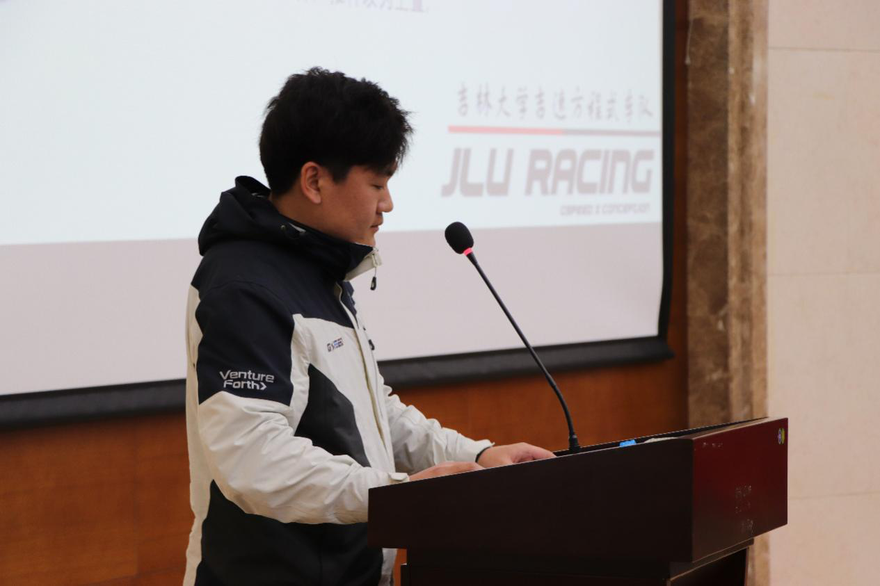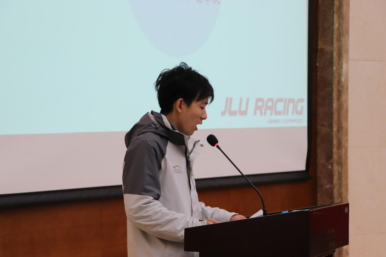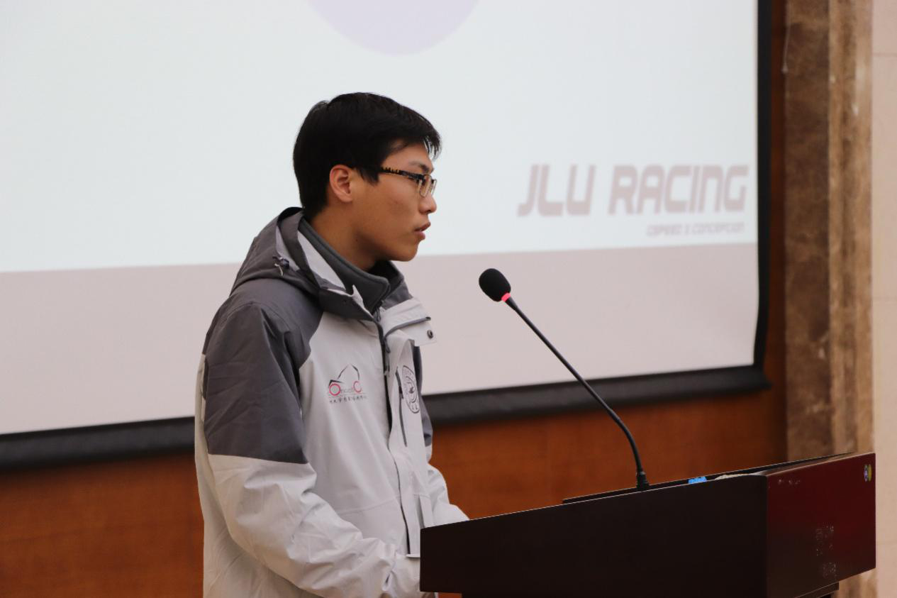 会议伊始,学生车队各队长依次上台介绍四支学生车队新赛车设计制造概况和技术特点。