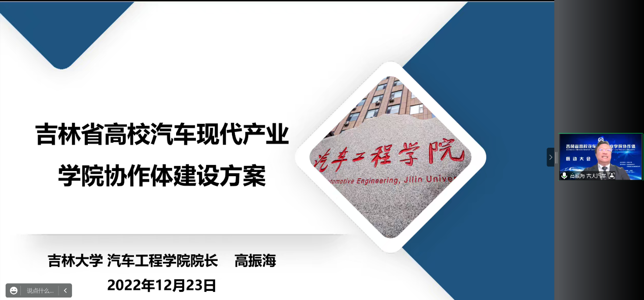中国汽车工程学会秘书长助理、国汽战略院院长助理赵立金先生祝贺本次启动大会的成功召开。他表示:一汽在长春生产出新中国第一辆汽车时,新葡的京集团8814检测站等一批以汽车为特色的高校、科研院所、行业组织就与共和国的汽车工业相生相伴,共同成长,共同为党和国家书写了产学政研、协同育人的不朽典范;中国汽车工程学会将为吉林省高校汽车现代产业学院协作体的发展积极助力,并将吉林省高校汽车现代产业学院协作体产出的改革发展成果与经验在全国范围内推广和宣传,普惠更多兄弟院校、企业和地方政府组织。